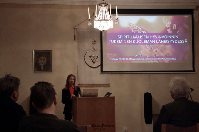 Virpi Sipola, terveystieteen tohtori, pappi piti jäsenillan 18.2.2025 aiheesta Spirituaalisen hyvinvoinnin tukeminen kuoleman läheisyydessä.